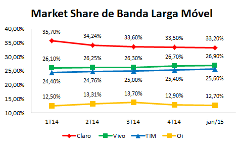 A Claro era a lider em market share de banda larga móvel no Brasil em jan/15, último mês para o qual a Anatel havia divulgado estas informações quando da publicação deste comentário.