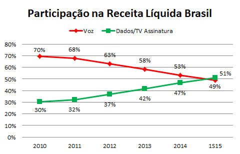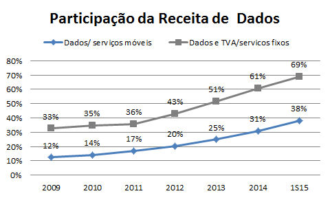 No setor de telefonia fixa, a banda larga já domina desde 2013. Os usuários passaram a adquirir as linhas fixas não para falar, mas apenas para servir como um ponto de acesso à internet e TV por Assinatura. Para ser mais preciso, esses dois serviços já representam, em 2015, 69% do faturamento total do segmento.