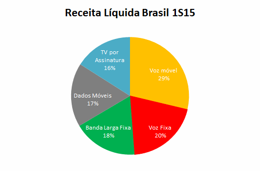 Apesar de ter sido ultrapassada pela soma de outros serviços, a receita com voz no celular continua sendo de extrema importância para as operadoras, representando 29% de seus faturamentos totais. Voz Fixa representa 20%; Banda Larga Fixa (18%); Internet Móvel (17%) e TV Paga (16%). Para ter uma ideia do que isso significa, veja a imagem do gráfico abaixo: