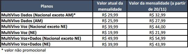Os planos MultiVivo – que oferecem o compartilhamento de conexão de voz e dados entre dispositivos diferentes – vão passar por uma acréscimo de até 5 reais na mensalidade, dependendo da opção escolhida. De todas as regionais do país, a Nordeste (composta por Alagoas, Ceará, Paraíba, Pernambuco, Piauí e Rio Grande do Norte, no mapa das telecomunicações brasileiro) é a que sofrerá o menor impacto, com reajuste de até 4 reais.