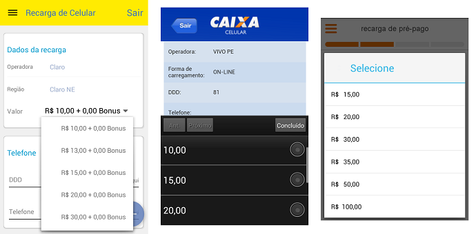 Nos serviços de recarga eletrônica, seja na internet, atendimento eletrônico (URA) ou por mensagem de texto (SMS), as recargas mais baratas não são sequer lembradas pelas empresas. Fizemos um teste no internet banking de três dos principais bancos brasileiros e o menor valor que encontramos para recarregar foi 10 reais.