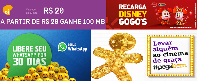 A Oi prefere incentivar recargas a partir de R$ 20, premiando todo cliente que recarregar acima desse limite mínimo através dos seus meios de recarga virtuais com 100 MB de franquia para acessar à internet. Enquanto que a TIM libera 50 MB para gastar com o WhatsApp todos os dias, durante um mês inteiro, para quem colocar a partir de R$ 30 em créditos. Com R$ 30 de recarga somados no mês, a Vivo paga a metade do ingresso de cinema na rede Cinemark para os participantes do programa de relacionamento Vivo Valoriza.