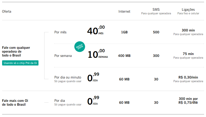 | No plano mais competitivo da Oi, minutos para qualquer operadora e grande pacote de internet são oferecidos a 10 reais por semana. |