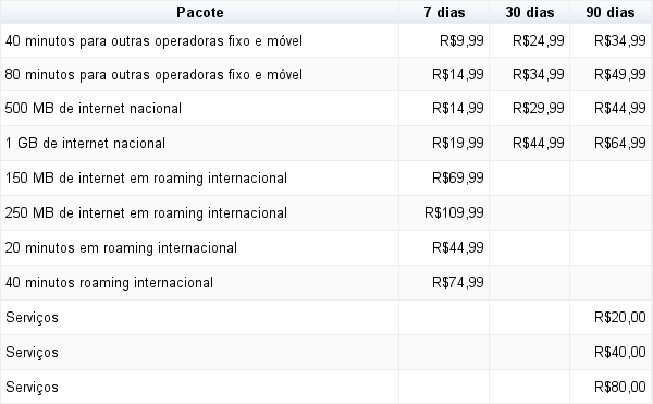 É possível contratar até 1GB de internet adicional para usar dentro da rede Vivo no Brasil; até 250MB de internet adicional para utilizar fora do país (em roaming internacional); até 80 minutos para falar com qualquer operadora nacional; até 40 minutos para usar em roaming internacional; e ainda comprar pacotes com serviços agregados, no estilo Portal de Voz, Vivo Segurança Online, Vivo Sync, dentre outros.