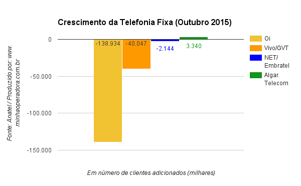 Agora, a maior companhia de telefonia fixa do país é também a que mais sofre com a migração dos clientes para o celular. Podemos dizer que a base de clientes do grupo Oi simplesmente despencou durante o décimo mês de 2015. É difícil de acreditar, mas a operadora perdeu sozinha -138,934 mil assinantes, mais do que o dobro da perda de todas as outras concorrentes juntas.
