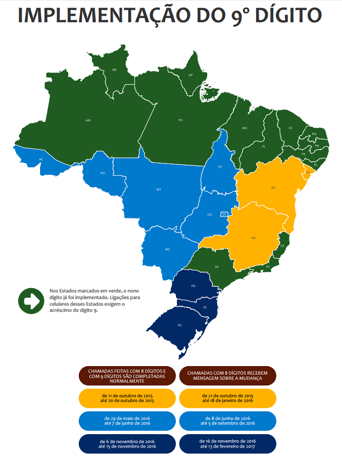 A Agência Nacional de Telecomunicações (Anatel) concluiu o cronograma para os estados brasileiros que ainda faltam receber o dígito nove na frente dos números de celular atuais. A adesão dos estados será feita durante todo o ano de 2016.