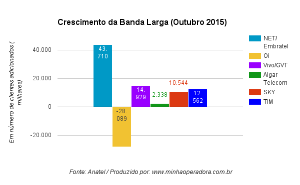 Dados do setor de internet banda larga fixa referentes ao mês de outubro de 2015, divulgados pela Agência Nacional de Telecomunicações (Anatel), mostram que as operadoras Embratel e NET foram as que se saíram melhor na captação de novos clientes. Juntas, as empresas adicionaram 43,710 mil clientes nas suas bases.