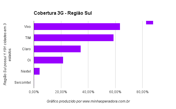 Na região Sul, a TIM quase alcança a Vivo em cobertura 3G. É a menor diferença entre uma operadora e sua concorrente nos dados das cinco regiões brasileiras. Também pudera, a melhor performance nacional da TIM fica no Paraná, onde a operadora atende 86,2% das cidades.