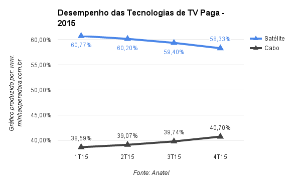 Mas os indicadores por tecnologia vem surpreendendo. Depois do grande salto que o sistema via satélite deu nos últimos anos, em 2015 ele começou a cair (-2,44%), enquanto o cabo voltou a crescer (+2,11%). A tecnologia FTTH (por fibra) também apresentou desempenho positivo, acumulando um ganho de 0,34% durante o ano passado.