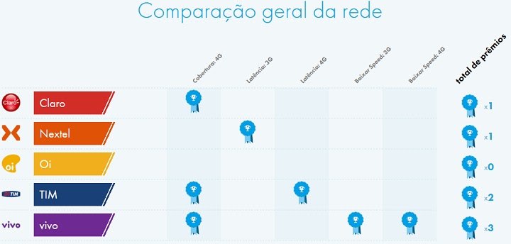 A Vivo foi líder em velocidade, com média de 15.32 Mbps, seguida pela Oi (11.92 Mega); Claro (11.36 Mega) e TIM (10.28 Mega).