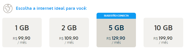 Se quiser um pacote com mais internet, pode solicitar a mudança da franquia a qualquer momento. O plano com 2 GB de internet (o dobro de dados) pode ser contratado por uma diferença de mais 10 reais do plano com 1 Giga (R$ 109,90). 5 GB custa R$ 129,90 por mês e 10 GB sai por R$ 199,90 mensais. O benefício de ligações e torpedos ilimitados para qualquer operadora permanecem válidos em todas as opções.