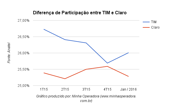 Na apresentação dos resultados do ano de 2015, mostramos que a Claro estava voltando a se aproximar da TIM, que teve um ano com desempenho ruim, perdendo mais de 3 milhões de clientes. Porém, a TIM começou 2016 com o “pé direito”, e apresentou o único saldo positivo do mês de janeiro: 669,78 mil novos usuários registrados na rede.