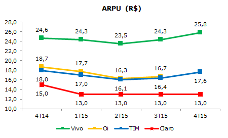 A TIM arrecada o equivalente a R$ 17,60 por cliente, enquanto a Claro registra apenas R$ 13. A Oi ainda não divulgou os dados referentes ao final do ano.