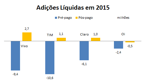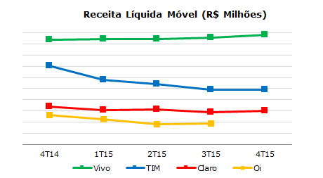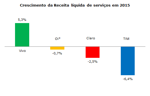 O faturamento da Vivo durante o ano de 2015 merece destaque. A operadora do Grupo Telefônica cresceu 6,2%, com receita líquida (depois de já deduzidos os impostos) de R$ 21,5 bilhões. A TIM faturou R$ 16,4 bilhões e a Claro R$ 12 bilhões. A Oi ainda não divulgou os seus dados financeiros.