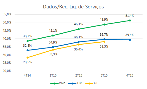 A Vivo já arrecada mais dinheiro com dados (internet e serviços agregados) do que com chamadas telefônicas. 51,4% do total da sua receita, cerca de R$ 11 bilhões, vem do serviço de dados. Para efeito de comparação, somente 39,4% da receita da TIM é proveniente dos serviços de internet.