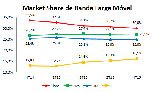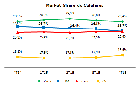 A Vivo é a maior operadora de celular do Brasil em número de clientes. São 28,42% de market share, contra 25,69% da TIM, 25,59% da Claro e 18,64% da Oi. Porém, nos últimos três meses do ano passado, Vivo e TIM apresentaram perdas consideráveis de clientes, o que ajudou Claro e Oi a resgatar esses usuários perdidos.