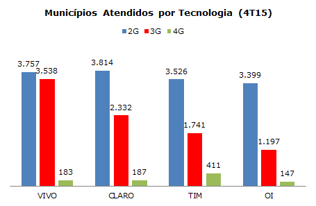 Quando se soma o número de municípios atendidos nas três tecnologias móveis, a Vivo lidera com folga.