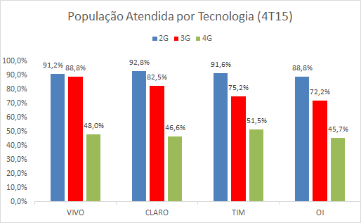 A briga é grande entre a Vivo e a Claro para ver qual delas chega mais longe. Interessante é que no quarto trimestre de 2015, as três maiores operadoras do Brasil apresentaram uma cobertura populacional maior em tecnologias diferentes. A TIM é a líder em 4G, com 51,5% da população atendida; a Vivo é líder em 3G (88,8%) e a Claro tem área maior em 2G/GSM, com 92,8% dos brasileiros com cobertura.