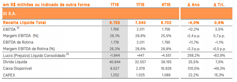 O faturamento líquido (receita) da Oi foi de R$ 8,75 bilhões, uma alta de 0,8% em comparação com o 4T15, porém caiu -4% em relação ao 1T15.