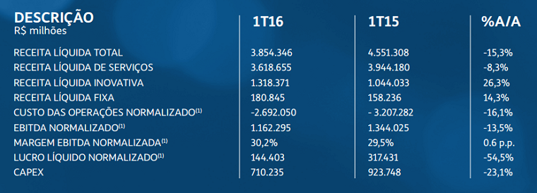 A operadora finalizou o período com uma queda na sua receita (faturamento) líquida de 15,3%, que passou de R$ 4,55 bilhões no 1T15 para R$ 3,85 bilhões no 1T16. Em comparação com o 4º trimestre de 2015, o resultado atual é -6,3% menor.