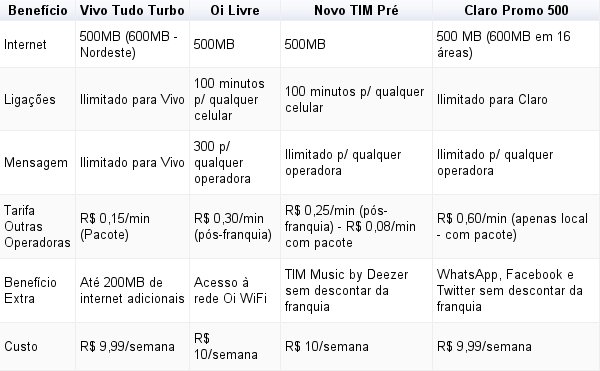 TIM, Oi e Claro já ofereciam 500MB nas suas promoções semanais da faixa de R$ 10. Veja como ficam agora as opções de uma forma resumida: