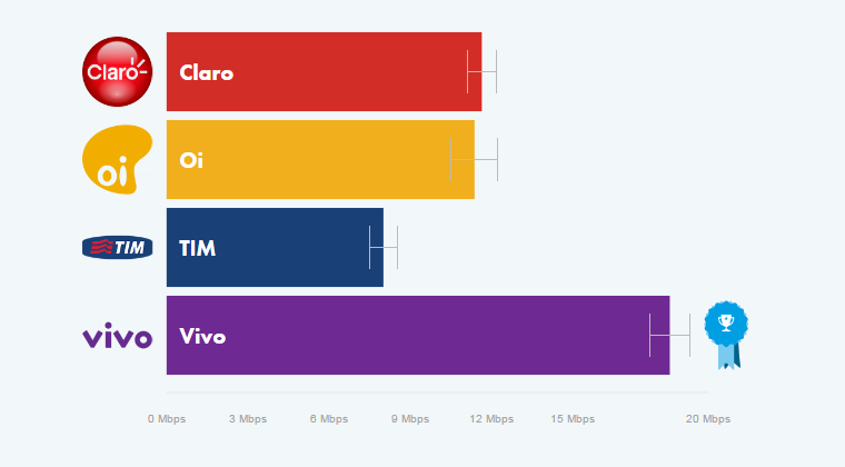 Enquanto isso, na tecnologia 3G, ainda utilizada em mais de 135 milhões de acessos, a Vivo também é a líder, com 2,43 Mbps de velocidade média, seguida pela Claro (2,36 Mbps), TIM (2,24 Mbps), Oi (1,64 Mbps) e Nextel (1,11 Mbps).