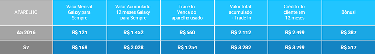 Inicialmente, participam do Galaxy para Sempre os smartphones Samsung Galaxy S7 e Samsung Galaxy A5 2016. A mensalidade a ser paga para o programa de fidelidade varia entre R$ 121 (para o A5) e R$ 169 (para o S7). Esses valores não incluem o valor pago pela compra do primeiro aparelho.