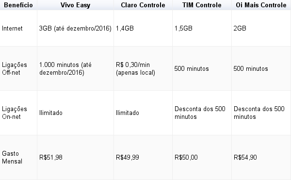 Com essas condições, o plano Vivo Easy se estabelece como sendo o plano pós-pago mais competitivo do setor. O Minha Operadora fez um comparativo com os planos controle da concorrência na faixa de preço de R$ 50, a pedido do nosso leitor Carlos Alberto, de Areia Branca, RN.