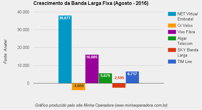 Os planos de internet banda larga residencial (NET Vírtua) e comercial (Embratel) do grupo América Móvil foram os mais disputados durante o mês de agosto de 2016. De acordo com relatório divulgado pela Agência Nacional de Telecomunicações (Anatel), os serviços de internet fixa do grupo mexicano no Brasil atraíram 38.077 novos clientes, encabeçando a lista das empresas que mais cresceram.