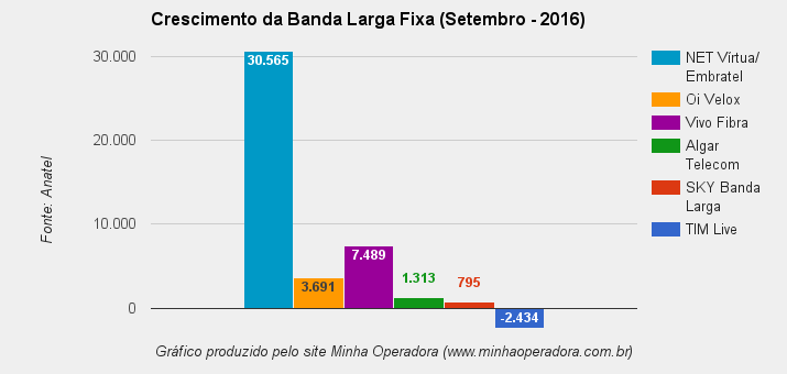 A TIM foi a única a registrar desativação de assinaturas maior do que o número de novas adesões (-2.434). Todas as demais operadoras aumentaram suas bases, com destaque para o serviço NET Vírtua/Embratel, que liderou o crescimento da banda larga com 30.565 novas vendas.