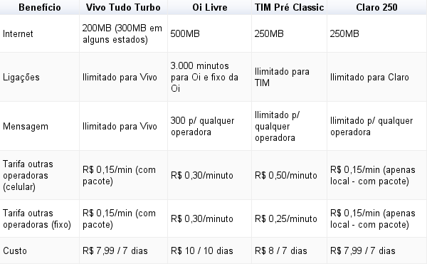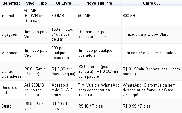 Trazemos abaixo duas tabelas comparativas atualizadas. A primeira exibe promoções calculadas para quem quer gastar, em média, R$ 10,00 por semana e dá prioridade para ofertas com minutos para outras operadoras (off-net).