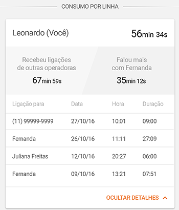 Um recurso que deve facilitar muito o momento de conferir o detalhamento de chamadas é a integração dos números apresentados na fatura com a agenda telefônica do usuário. O aplicativo checa a agenda e mostra na conta o nome de cada pessoa para quem o cliente ligou ou enviou mensagem SMS.