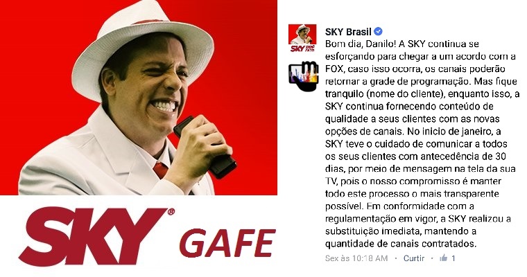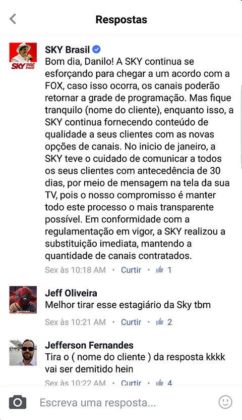 Todo mundo sabe que as empresas costumam ter respostas prontas para tudo aquilo que os consumidores perguntam nas redes sociais. Mas isso ficou explícito na última sexta-feira (10), quando a equipe de social media da Sky respondeu a um usuário que reclamava da saída dos canais Fox do seu line-up, e esqueceu de preencher o campo “(nome do cliente)”.