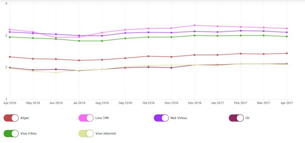 O índice de velocidade de conexão Netflix é feito com base no tempo que as operadoras demoram para carregar seus filmes e séries, de acordo com a média de bits de conteúdo da empresa nos equipamentos de seus assinantes em horário nobre. Desde agosto de 2016, a TIM Live tem se mantido no topo do ranking, como é possível ver no gráfico abaixo: