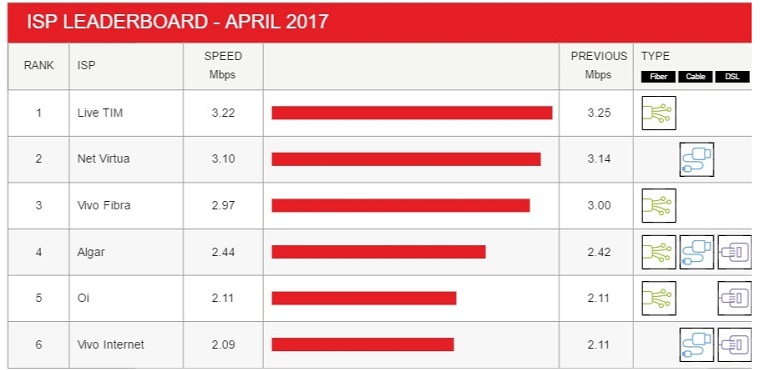 Como a TIM Live, a conexão por fibra óptica também é oferecida pela Algar Telecom (2,44 Mbps) e pela Oi (2,11 Mbps), que também disponibilizam serviços DSL e ficaram na quarta e quinta posições.