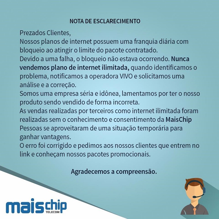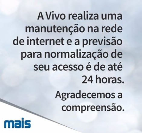 Tendo conhecimento do problema só neste mês de maio, a Mais AD publicou em sua página no Facebook, no dia 11, que a Vivo estaria realizando uma manutenção na rede e, por isso, muitos usuários poderiam enfrentar problemas para utilizar os serviços da empresa.