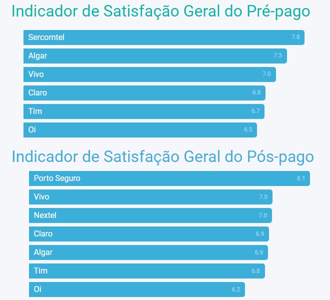 A Sercomtel se deu melhor no pré-pago, com avaliação 7.8, liderando Em Satisfação, Funcionamento e Atendimento.