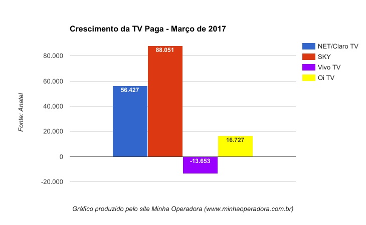 No total, o setor de TV por assinatura brasileiro fechou o mês de março de 2017 com 18,61 milhões de pontos legais instalados. Em comparação com fevereiro, isso representa uma queda de 9.989 acessos (-0,05%)