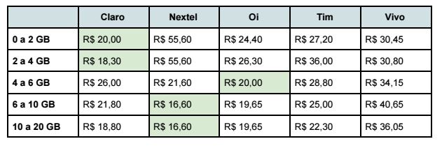 Um exemplo é a própria Claro, vencedora em velocidade de 4G no Brasil. Mesmo sendo a mais indicada aos usuários mais e menos ativos na internet, a operadora é, também, a mais barata em planos de 0 a 4 GB e a segunda melhor em planos de 10 a 20 GB – em comparação com a Oi, TIM, Vivo e Nextel.