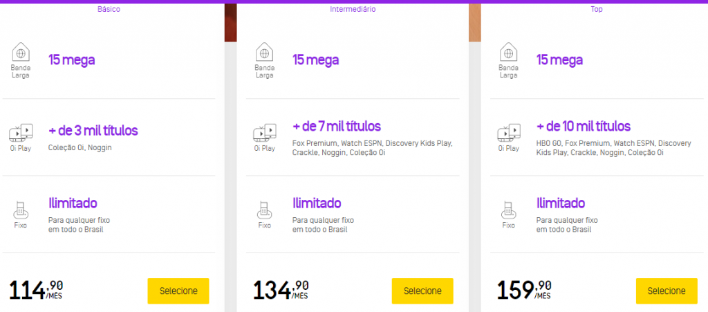 Intermediário por R$ 134,90: 15 Mega, Oi Play e Fixo ilimitado.