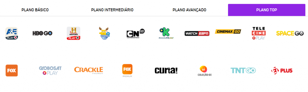 Básico: FOX, Globosat Play, Cartoon Network Go, Curta!, Discovery Kids play, Noggin, TNT GO e Coleção Oi.