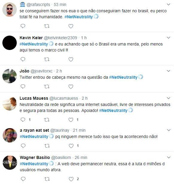 Além de Amazon, Netflix, Twitter, Mozilla e muitas outras empresas, ontem duas gigantes da internet anunciaram que apoiariam a ação: Google e Facebook. Hoje, a hashtag #NetNeutrality já atingiu mais de 25,5 mil Tweets, e mesmo os brasileiros decidiram entrar na luta pela internet e twittar sobre o assunto, como você pode ver no final da matéria.