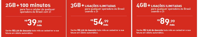 Existe ainda uma opção de plano com mais internet: 4GB de franquia e ligações ilimitadas para qualquer operadora, por R$ 89,99 por mês. Nesta opção, o plano pode sair por R$ 79,99 caso o usuário cadastre a conta no débito automático.
