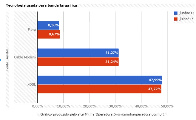 Como mostra o gráfico acima, a participação da fibra no mercado aumentou e já representa 8,67%, enquanto as redes com Cable Modem e xDSL sofreram redução entre junho e julho deste ano.