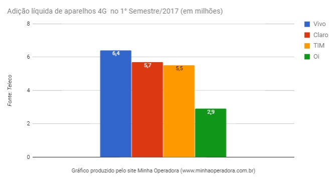 Vivo liderou em número de adições líquidas no 1° semestre desse ano com 6,4 milhões, seguido por Claro (5,7 milhões) e TIM (5,5 milhões).