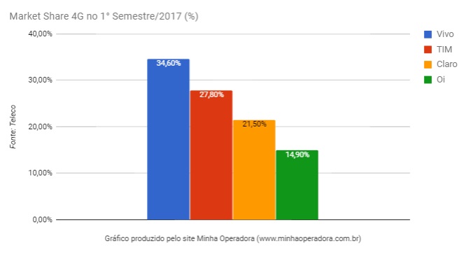 Apenas a Claro cresceu sua participação de aparelhos 4G no 1° semestre desse ano. A Vivo continua na liderança com 34,6% seguida pela TIM com 27,8% de participação no mercado.