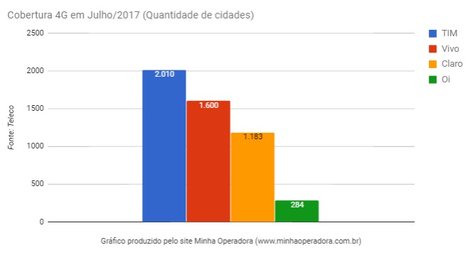 A TIM é a única operadora já alcançou a meta de 2 mil cidades com cobertura 4G, cinco meses antes do prazo estipulado pela operadora, junto com Claro e Vivo que vai até o fim do ano. Com cobertura em 1.600 municípios do país, a Vivo deve alcançar a meta até o fim do ano.