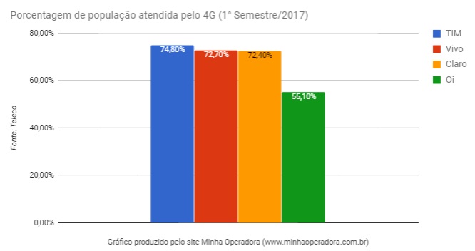 Com a liderança em quantidade de cidades, a TIM também lidera em porcentagem de população atendida, seguida de perto por Vivo e Claro. Mesmo com uma cobertura baixa, atendendo bem menos cidades que as concorrentes, a Oi atende cerca de 55,1% da população brasileira.