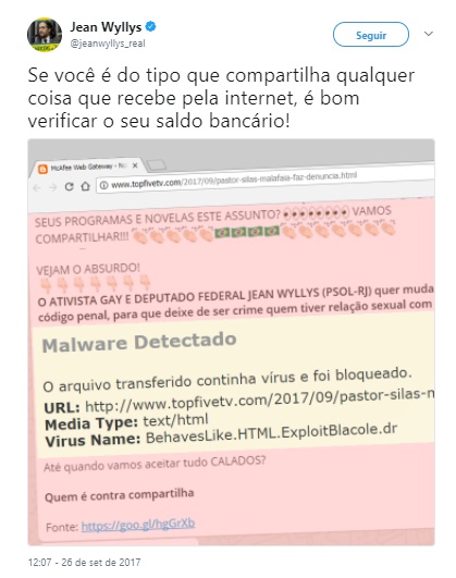 Em outro tweet, Jean Wyllys chamou a atenção dos usuários pedindo para que eles prestem mais atenção sobre o que compartilham e acessam na internet. Independente de sua opinião sobre o trabalho do deputado ou de qualquer outra pessoa pública, é importante estar sempre atento para evitar clicar em links desconhecidos e atrair vírus para seu computador ou dispositivos móveis.