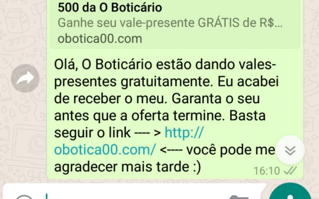 Essa não é a primeira que a marca O Boticário é usada num golpe de WhatsApp. No mês de abril deste ano, outra falsa promoção prometia um vale-presente de R$ 500 nas lojas da rede e fez 50 mil vítimas em cinco dias, segundo o PSAFE.